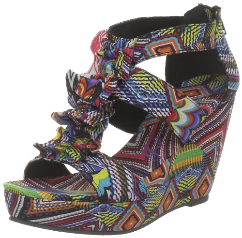 Blowfish Tacita Wedge Sandal. This style takes this seasons bold prints and offers you a stylish must-have sandal. Featuring a pritned wedge, front ruched detailing and back zip fastening.